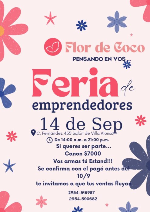 14h Feria de emprendedores “Flor de Coco” en el Salón de Jubilados de Villa Alonso (Crispiniano Fernández 455).