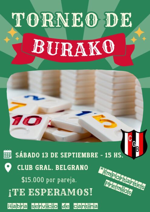 15h Torneo de Burako en el Club Gral. Belgrano (Av. Belgrano). Importantes premios y servicio de cantina.