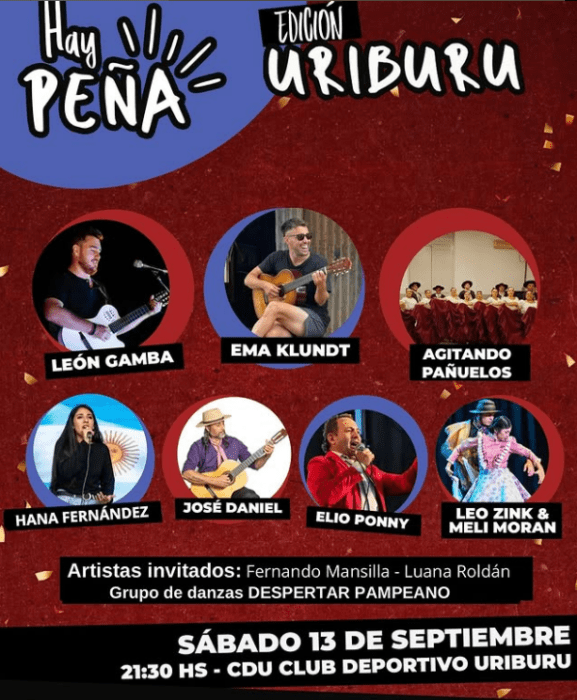 21.30h Hay Peña – Uriburu! Una noche llena de música, danza y tradición para compartir entre amigos y familia en el CDU Club Deportivo Uriburu. Entradas en venta en Uriburu, Lonquimay, Anguil, Santa Rosa y Catriló. ¡Una noche a pura peña!