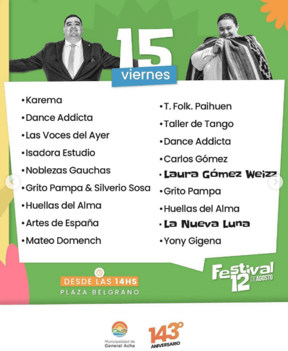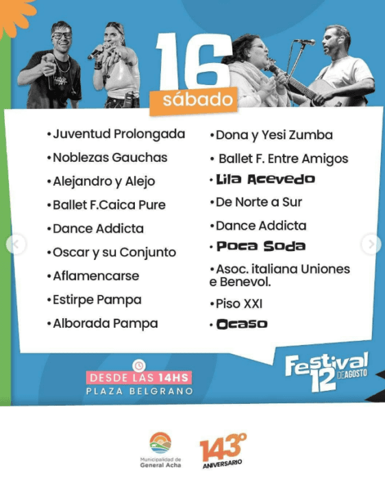 14h Festival Aniversario 143 en la Plaza Belgrano. La grilla oficial incluye diversidad de artistas y músicos. Artistas, emprendedores, artesanos, gastronómicos, turismo y sorpresas.