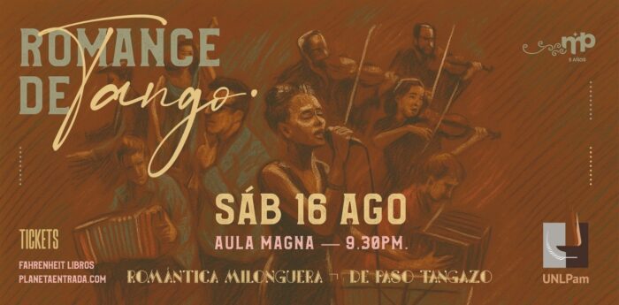 21:30h Ciclo Magna Tango “Romance de tango” en el Aula Magna de la UNLPam (Coronel Gil 353). Presentación de la orquesta Romántica Milonguera compartiendo escenario con “De paso tangazo”, una formación basada en la conjunción de sus guitarras y guitarrones recreando tangos y milongas emblemáticas. Venta de entradas: Fahrenheit Libros (9 de Julio 56) y Planetaentrada.com.