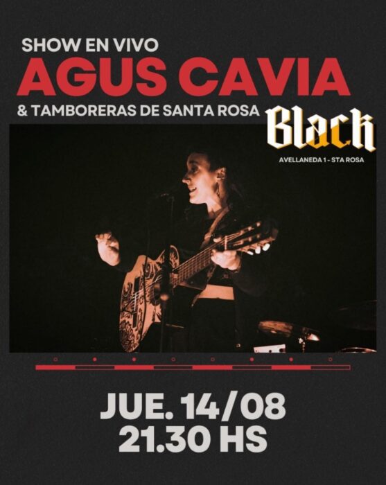 21.30h Show en vivo de Agus Cavia y tamboras de Santa Rosa en Black (Avellaneda 1).