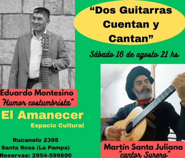 21h Dos guitarras cuentan y cantan en el Espacio Cultural El Amanecer (Rucanelo 2395). Se presentan Eduardo Montesino y Martín Santa Juliana.