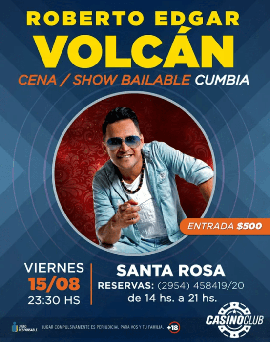 23.30h se presenta Roberto Edgar – Volcán en el Casino Club (Av Arturo Illia 850). Para bailar todos sus clásicos de la cumbia tropical.