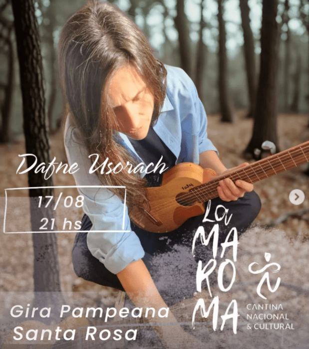 21h Dafne Usorach llega a La Maroma (Alvear 42). Con varios instrumentos (Guitarra, Pad de Percusión electrónica, bombo) y un pedal llamado loopera, Dafne va grabando en vivo las bases y arreglos de cada canción de manera dinámica e interactiva con el público. Reservas vía WhatsApp 2954-865326.
