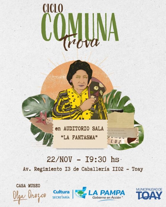 19.30h Actividad de extensión en la Casa Museo Olga Orozco (Av. Regimiento 13 de Caballería 1102), Sala “La Fantasma”. El Ciclo Comuna Trova presenta su tercera edición con la presencia de dos destacados trovadores de la escena local: Laura Quintero y Javier Avalis. En respuesta a la necesidad de revitalizar los espacios de escucha para la trova y la canción de autor.