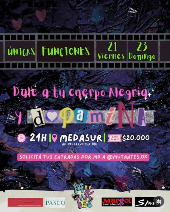 21h Compañía Mutantes OK presenta la obra teatral multidisciplinaria “Dale a tu cuerpo alegría y dopamina” en el Centro Cultural Medasur (Av. Belgrano Sur 180). A través de la fusión de distintas disciplinas escénicas, la obra invita a reflexionar sobre las múltiples formas que tiene el ser humano de amar. Se abordan temas como la Educación Sexual Integral (ESI), el amor propio, el cuidado del cuerpo, el respeto al otro y el bullying, desde una mirada fresca, divertida y profundamente humana. La puesta se desarrollará en distintos espacios dentro del Medasur. Experiencia inmersiva. Entradas anticipadas: $20.000 por mensaje al Instagram @mutantes.ok.