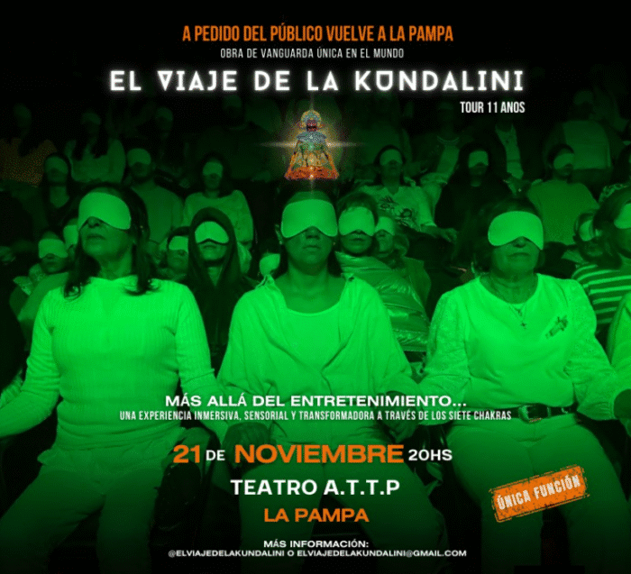 16h El viaje de la Kundalini en el Teatro ATTP (José Luro y Bolivia). Una experiencia sensoperceptiva única en el mundo. Con los ojos vendados, el público se sumerge en un viaje sonoro y sensoperceptivo a través de frecuencias solfeggio, instrumentos ancestrales, sonoterapia, mantras, música medicina, energía canalizada Reiki, Vortex Healing, cromoterapia y aromaterapia. Entradas disponibles a través de www.passline.com.