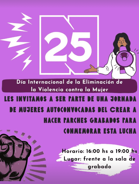 16h Jornada de Mujeres autoconvocadas del Crear a hacer parches grabados frente al Salón de grabado. En conmemoración del Día Internacional de la Eliminación de la Violencia contra la Mujer.