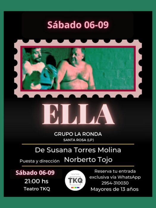 21h Teatro: Ella en el Teatro TKQ (Sarmiento y Cervantes). Sugerida para mayores de 13 años. Entradas a $ 8.000. Reservas por texto únicamente al WS: 2954-310030.