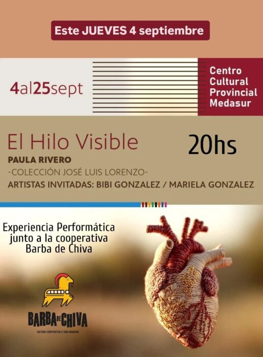 «El hilo visible», experiencia sensovisual y performática de la artista Paula Rivero en el Centro Cultural Medasur (Av. Belgrano 180), Espacio de Arte “Eduardo di Nardo”. La muestra, dirigida a un público adulto, presenta más de cien obras visuales, instalaciones y video arte. Es abierta y no requiere inscripción previa. «El hilo visible» estará abierta al público hasta el 25 de septiembre.