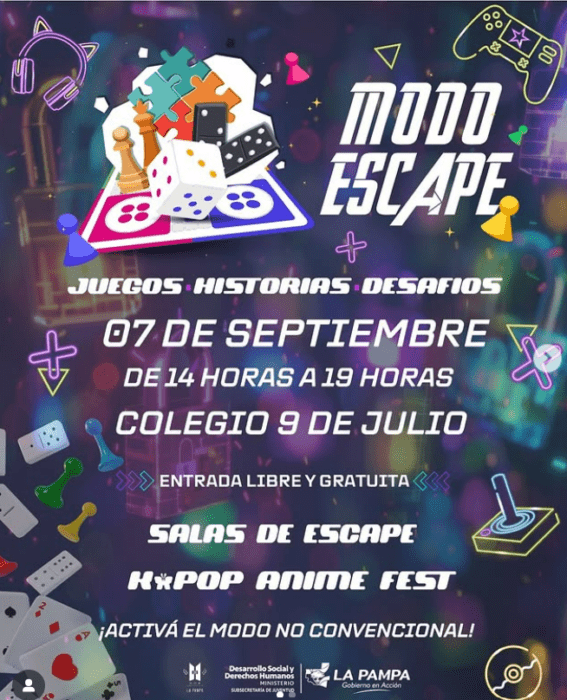 14 a 19h Tercera edición de Modo Escape en la Kpop Anime Fest en el Colegio Secundario 9 de Julio (9 de Julio 375). Juegos, cultura pop, tecnología y experiencias colaborativas para juventudes, familias y público general. Salas de Escape. Partidas breves con enigmas y trabajo en equipo. Cupos por turno. Inscripción en el lugar por orden de llegada. Muestra de videojuegos pampeanos.
