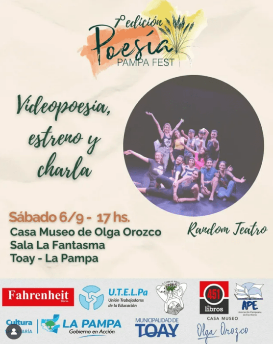 17h VII Festival de Poesía “Pampa Fest” en la Casa Museo Olga Orozco. Videopoema de Random Teatro: estreno y charla.