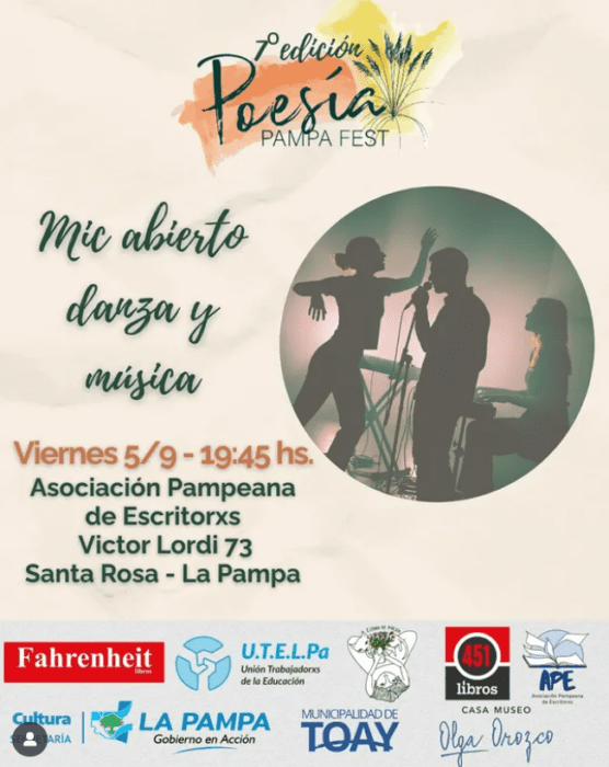 19:45h VII Festival de Poesía “Pampa Fest” en la Asociación Pampeana de Escritores (Víctor Lordi 73). Micrófono Abierto, coordinado por Sol Riscossa de Estado de Poesía librería, con la participación de Lucía López Varela en movimiento y danza y musicalización de Rocío Gonzaga.