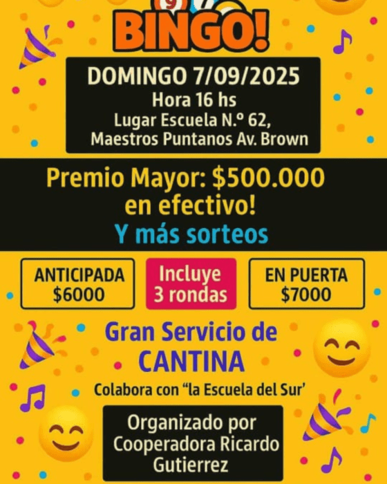 16h Bingo en la Escuela N°62 (Maestros Puntanos Av. Brown). Premios en efectivo y sorteos.