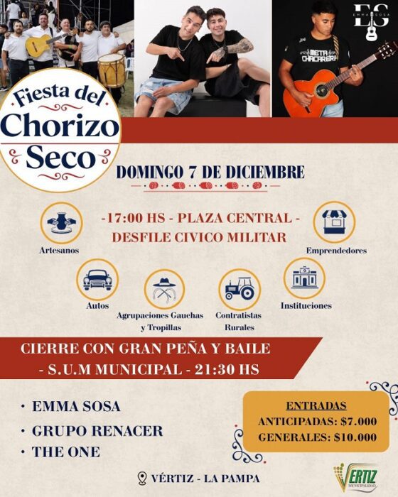 21:30h Peña folclórica con la actuación del grupo Renacer, la artista local Ema Sosa y The One. Durante el festival se podrá hacer una degustación del chorizo seco y los panes artesanales que se producen en Vértiz. Lugar: SUM Municipal.