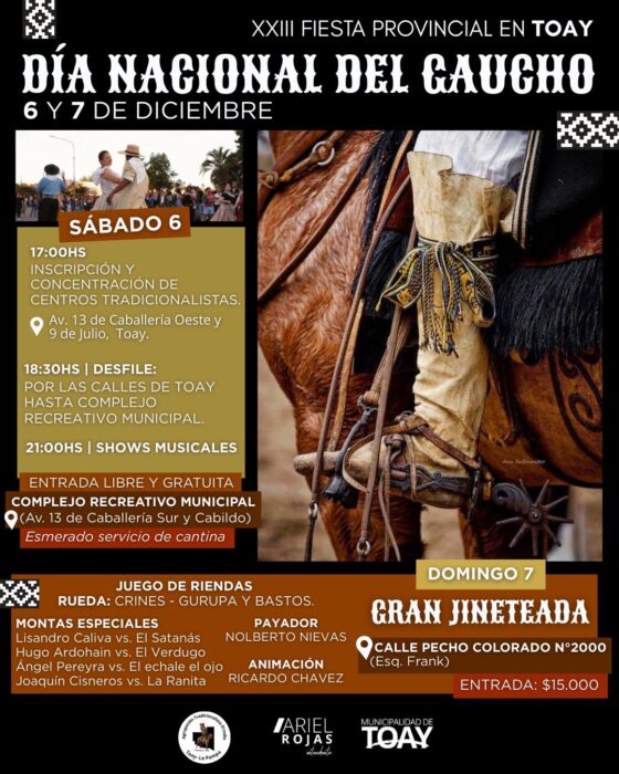 21h XXIII Fiesta Provincial «Día Nacional del Gaucho». Encuentro Rodantero en Toay, shows musicales. Complejo Recreativo Municipal. Gratuito.