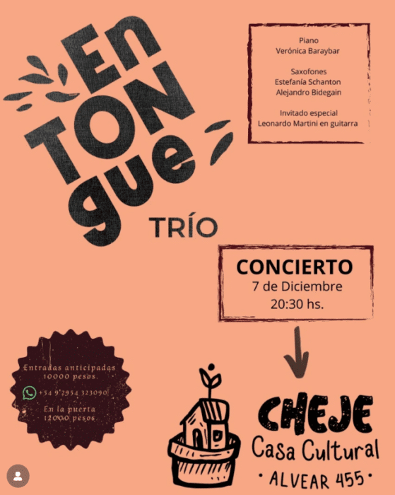 20.30h Concierto de Entongue Trío en Cheje Casa Cultural (Alvear 455). Un viaje por el tango y sus raíces culturales, con una propuesta que enlaza tradición y actualidad a través de compositores clásicos y contemporáneos. Reservas: 2954 323090.
