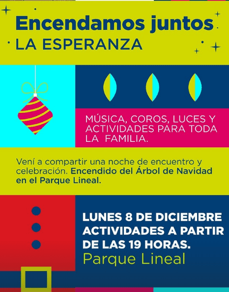 19h Encendido del Árbol de Navidad en el Parque Lineal. Música, coro, luces, un día para disfrutar de amigos y familia.