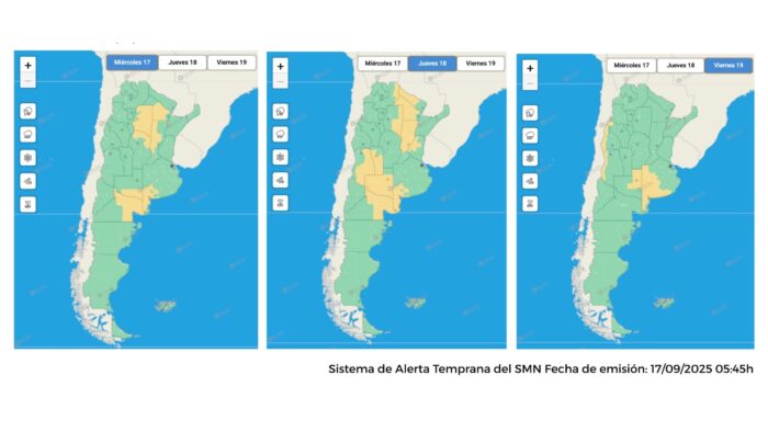 En tanto, para el día jueves 18 de septiembre, el alerta afectará a gran parte de la provincia de La Pampa y se extenderá a otras provincias como Mendoza, San Luis y el sur de Buenos Aires.