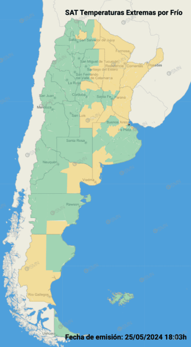 Esta tarde el Servicio Meteorológico Nacional (SMN) levantó el alerta por temperaturas extremas -frío- para La Pampa para este sábado. Sin embargo sigue vigente para el resto de país, incluso se sumaron al alerta nuevas provincias del norte argentino: Tucumán, Formosa, Jujuy, Catamarca, Santa Fé, Córdoba y Misiones.