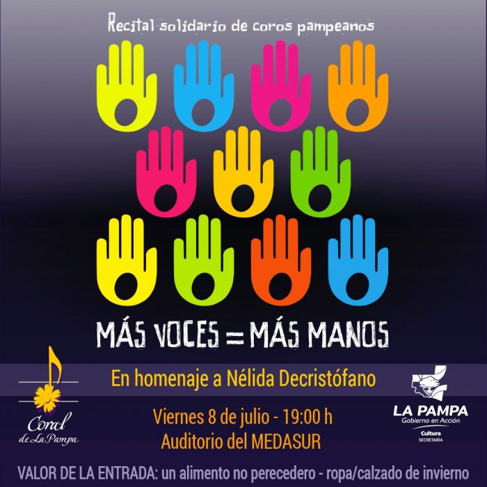 Después de dos años de pandemia y de restricciones sanitarias, esta tarde a las 19 horas en el Auditorio CC Medasur de Santa Rosa, en Av. Belgrano Sur 180, se vuelven a desarrollar los Conciertos corales solidarios: “Más voces = Más manos”. Esta vez, a beneficio del Hospital Lucio Molas, de Santa Rosa.