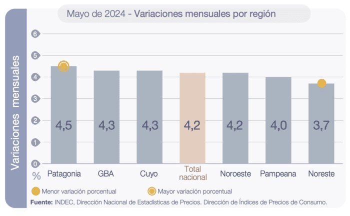 La división con mayor incidencia en todas las regiones del país fue Alimentos y bebidas no alcohólicas (4,8%), donde se destacaron los aumentos de Verduras, tubérculos y legumbres; Leche, productos lácteos y huevos; y Aceites, grasas y manteca.