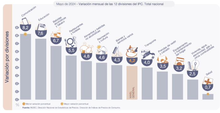 Las dos divisiones que registraron las menores variaciones en mayo fueron Salud (0,7%), por bajas en las cuotas de medicina prepaga, y Vivienda, agua, electricidad y otros combustibles (2,5%).