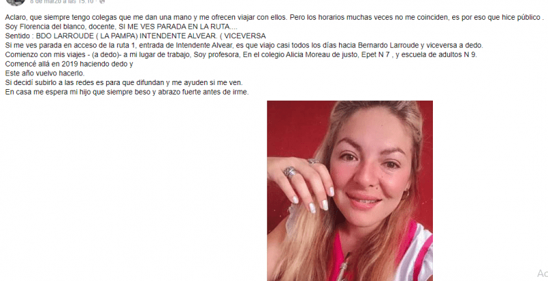 «Soy Florencia Del Blanco, docente. Si me ves parada en la ruta, sentido Bernardo Larroudé – Intendente Alvear (o viceversa), o si me ves parada en el acceso de la ruta 1, es que viajo casi todos los días a dedo. Comienzo con mis viajes a mi lugar de trabajo. Soy profesora en el Colegio Alicia Moreau de Justo, en la EPET 7 y en la Escuela de Adultos 9. Comencé allá en 2019 haciendo dedo y este año vuelvo a hacerlo. Si decidí subirlo a las redes es para que difundan y me ayuden si me ven. En casa me espera mi hijo que siempre beso y abrazo fuerte antes de irme», publicó en su perfil de Facebook.