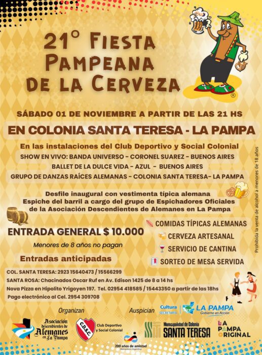 21h en el Club Deportivo y Social Colonial. Variada propuesta artística y gastronómica. Entre los espectáculos programados se destacan la Banda Universo de Coronel Suárez (Buenos Aires), el Ballet de La Dulce Vida de Azul (Buenos Aires) y el Grupo de Danzas Raíces Alemanas de Colonia Santa Teresa. Como es tradición, la fiesta comenzará con el desfile inaugural con vestimenta típica alemana y el simbólico espiche del barril, a cargo del grupo de espichadores oficiales de la Asociación de Descendientes de Alemanes en La Pampa. El evento contará con comidas típicas alemanas, cerveza artesanal, servicio de cantina y sorteo de mesa servida.