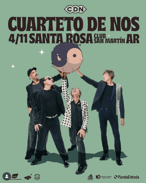 21h llega El Cuarteto de Nos al Club San Martín (Alberdi 325). La banda uruguaya llega con su tour Puertas con letras cargadas de ironía, crítica social y un estilo único que combina rock, pop y rap. Conseguí tus entradas a través de @planetaentrada https://planetaentrada.com/CUARTETO-DE-NOS—SANTA-ROSA/ Locales: Small Center (L. de la Torre 96 esq C. Gil) @smallcenter Lokura Fans (9 de julio 225) @lokurafans Cantina Club Estudiantes (Moreno 651).