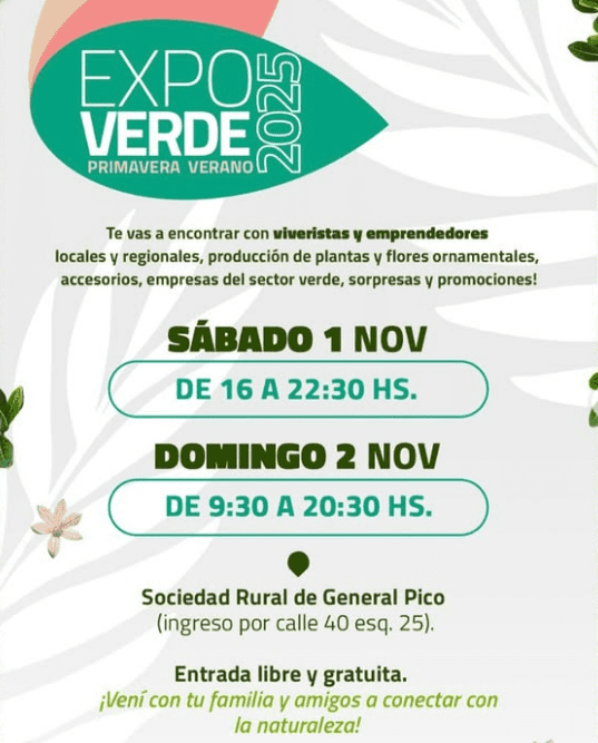 16 a 22.30h 8va Edición de la Expo Verde y 2do Festival del Café en la Sociedad Rural de General Pico (ingreso por calle 40 esq. 25). La entrada será libre y gratuita para todo el público. Para obtener mayor información o realizar consultas comunicarse al 2302 – 544235.