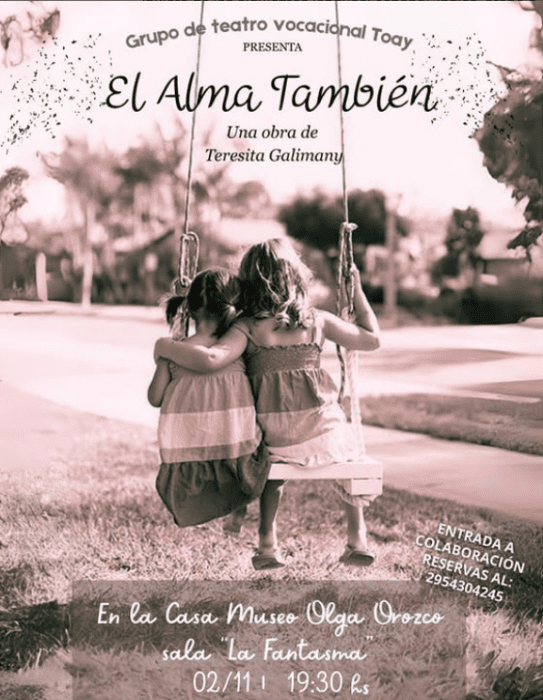 19.30h Teatro: “El alma también”, una obra de Teresita Galimany en la Casa Museo Olga Orozco – Sala La Fantasma. Reservas: 2954-304245. Entradas a colaboración.
