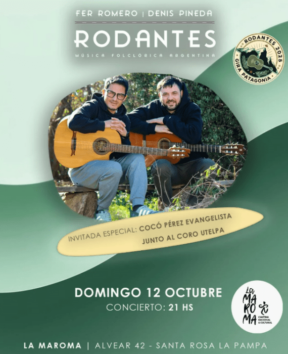 21h se presenta Rodantes, Fer Romero y Denis Pineda, en La Maroma (Alvear 42). Entradas anticipadas disponibles. Reservas por WhatsApp 2954-86 53 26.