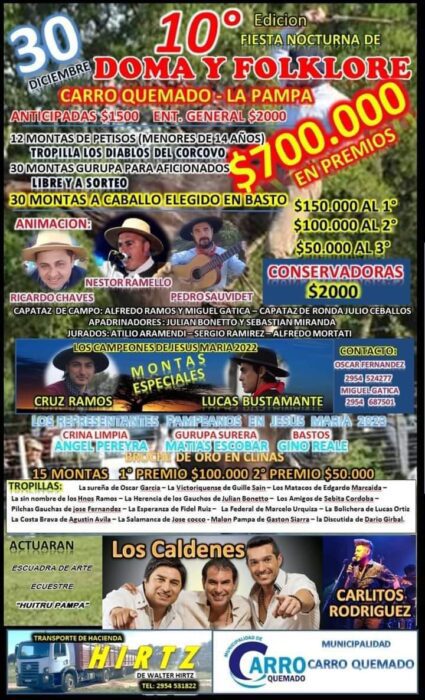 En Carro Quemado se estará realizando la 10° edición del Festival Nocturno de la Ruta de la Cría. El festejo contará con 12 montas de petisos, 30 montas gurupa para aficionados, 30 montas a caballo elegido en basto más montas especiales animarán la jornada nocturna con la conducción de Ricardo Chaves, Néstor Ramello y Pedro Saubidet. La propuesta artístico cultural estará conformada por la actuación de la Escuadra de Arte Ecuestre «Huitru Pampa» y un cierre musical con Los Caldenes y Carlitos Rodríguez.