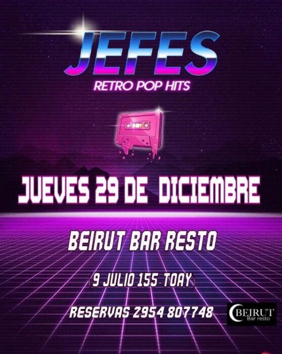 En Toay se estará presentando la banda Jefes Retro Pop Hits para despedir el año, la cita es en el espacio de Beirut Bar Resto (9 de Julio 155). Las entradas pueden reservarse al número 2954 – 807748.