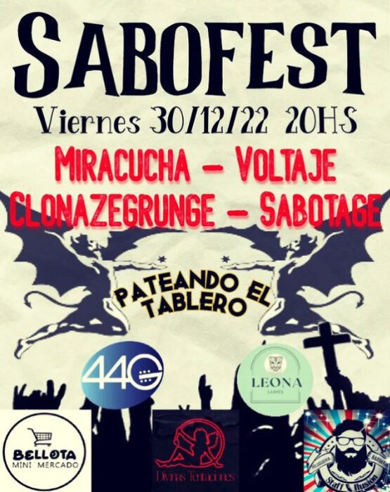 En Pateando el Tablero (Av. Ing Santiago Marzo Este 192) se realizará la SaboFest con varias banda en escena que estarán presentando sus trabajos, tocaran: Miracucha, Voltaje, Clonazegrunge y Sabotage. El encuentro es a partir de las 20 hs.