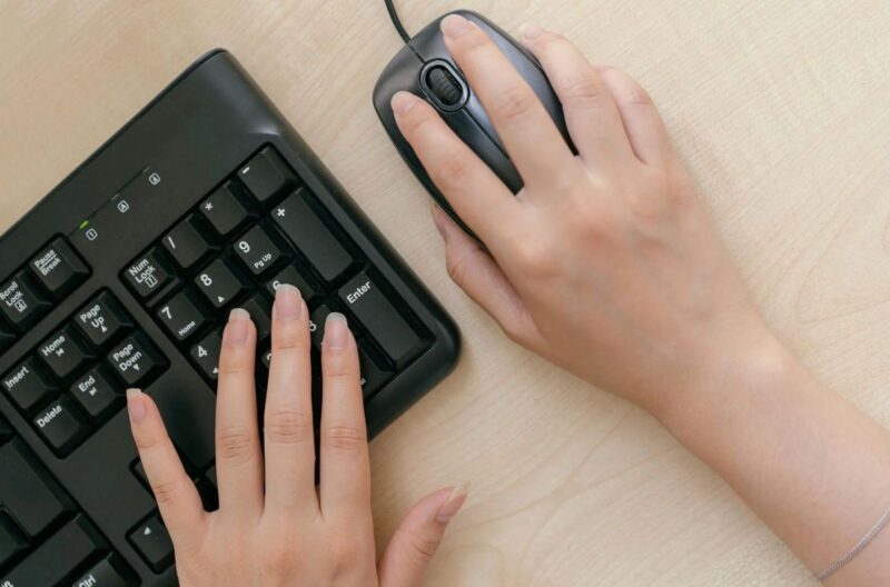 - Teclado por delante, con muñecas, antebrazos alineados y hombros relajados, con el mouse en la misma superficie que el teclado.