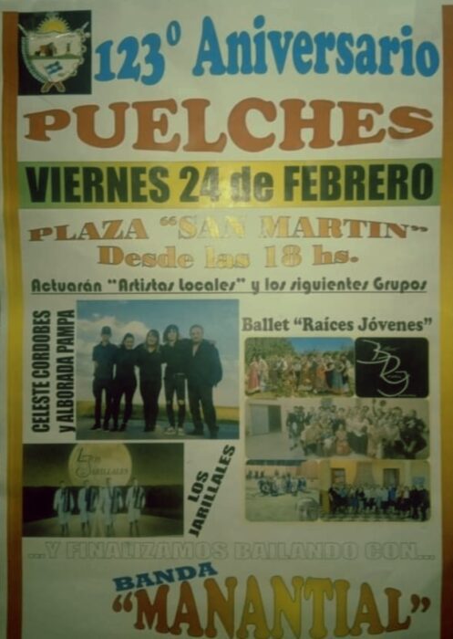 En Puelches se estará celebrando el 123° aniversario de Puelches. Su fundación fue el 24 de febrero de 1900. La celebración se realizará hoy viernes desde las 18 hs. en la Plaza San Martín. Habrá espectáculos artísticos con la participación de artistas locales y la actuación de Celeste Cordobés y Alborada Pampa, Ballet Raíces Jóvenes, Los Jarillales. Gran cierre con Banda Manantial.