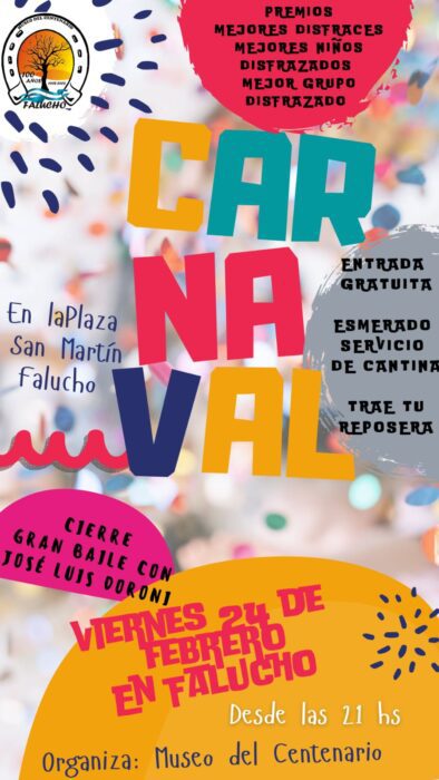En Falucho se estará celebrando el carnaval a partir de las 21 hs. en la Plaza San Martín. La entrada es libre y gratuita. Participan carrozas, comparsas, disfraces individuales. Gran baile con José Luis Doroni.