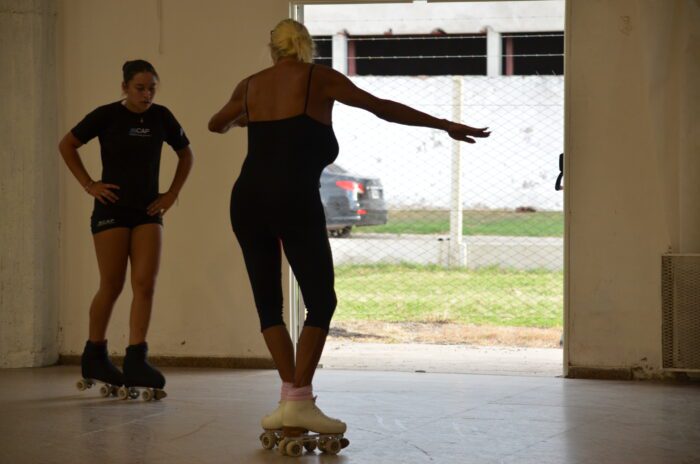 Y el patín tiene una particularidad, tenés que agarrar, levantar la pierna, agarrar la cadera, un montón. A veces alcanza con la palabra, pero otras veces tenés que manejar el cuerpo de la persona que tenés enfrente. Eso me produjo muchísimo miedo, porque tenía 20 pibes y 40 padres en la clase mirándome«.