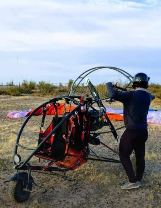 Tras dos años de aprendizaje, volvió a su pueblo con los conocimientos y práctica necesarios para la actividad. Sin embargo, también reconoció que las bardas de su pueblo no llegaban a tener la altura necesaria para tirarse por ellos con un parapente. Buscando una solución, invitó a su instructor a conocer la zona. Decidieron que lo mejor era otra modalidad: parapente a motor y vela sin altura, con trike. En esta técnica se utiliza una estructura metálica, similar a un triciclo con dos butacas y alas flexibles. El motor se utiliza en reemplazo de la altura, por lo que es posible carretear y despegar desde el piso.